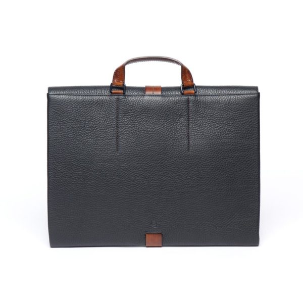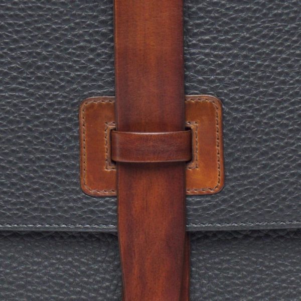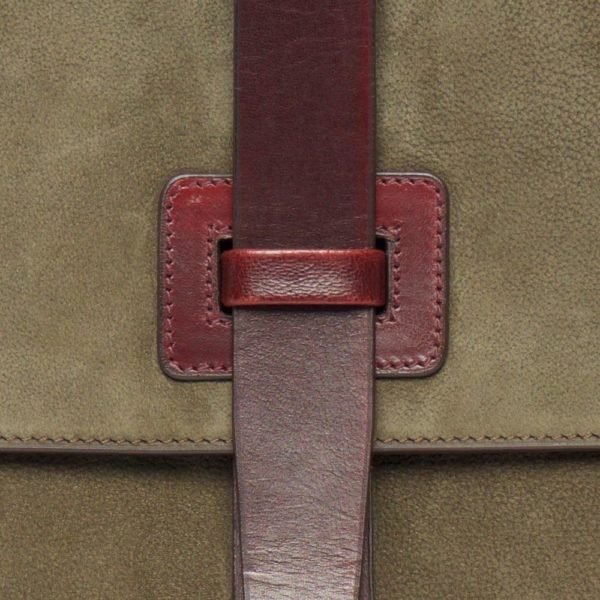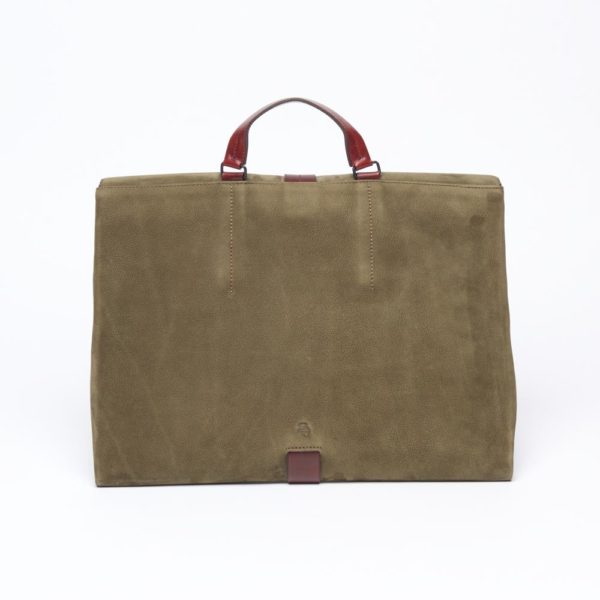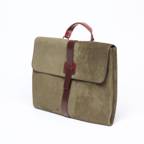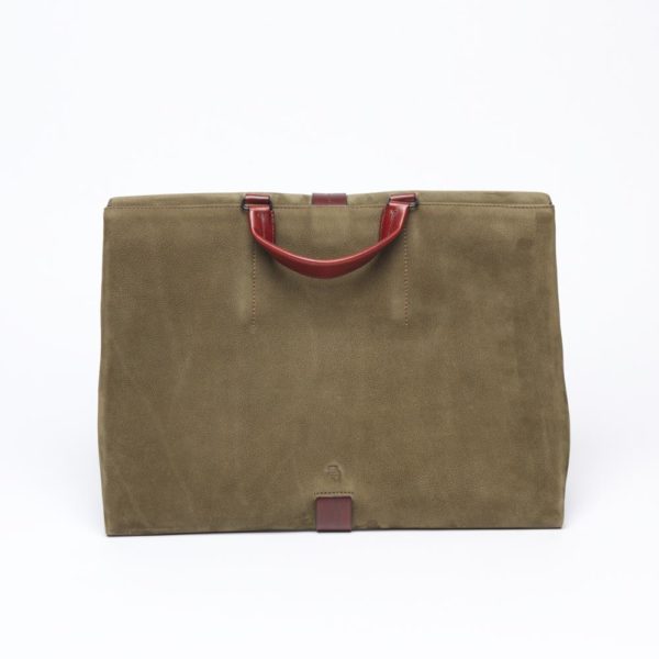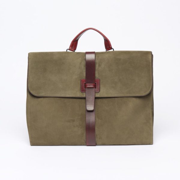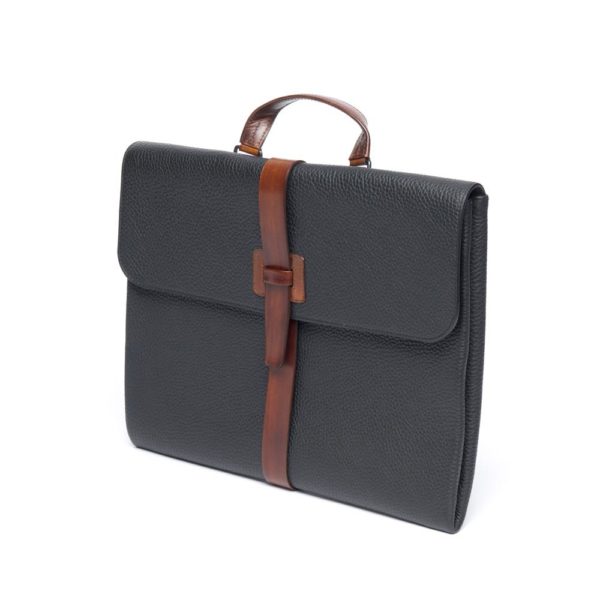 This slim satchel with folding handle is suitable for A4 documents and / or a tablet. It is lined in ecru cotton canvas.