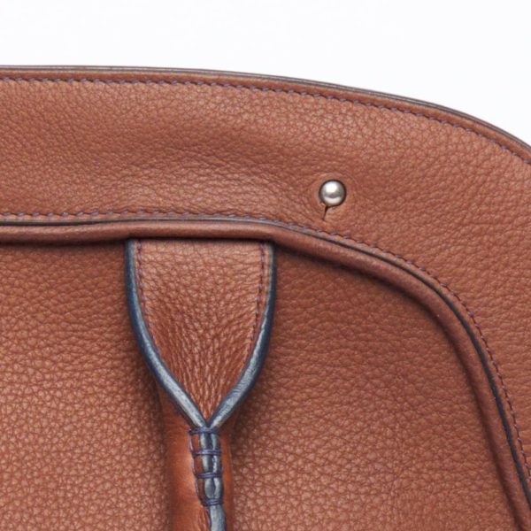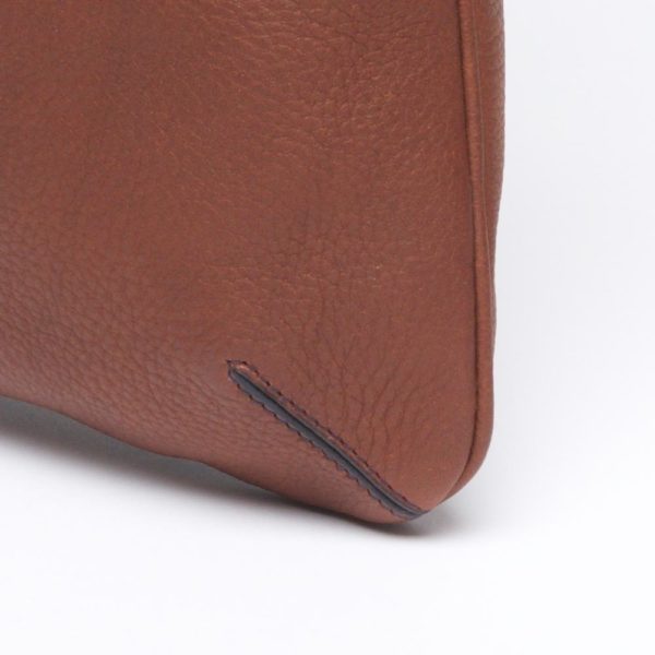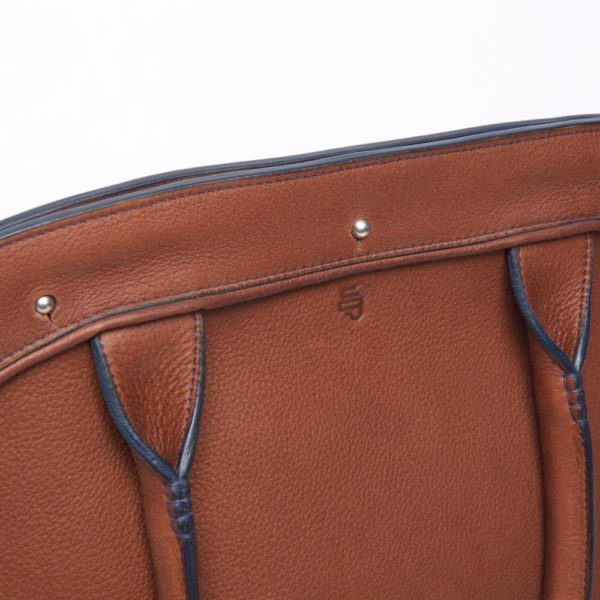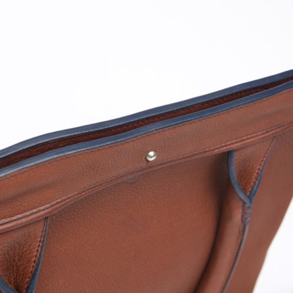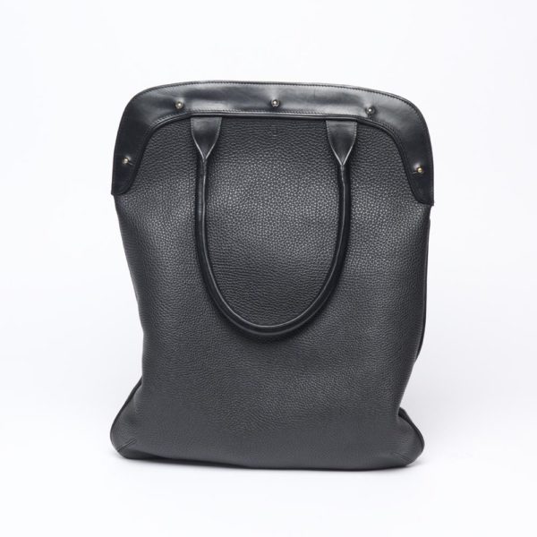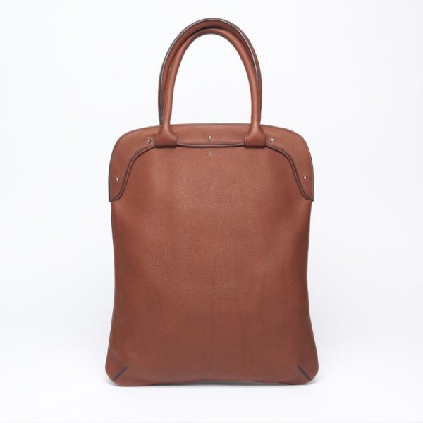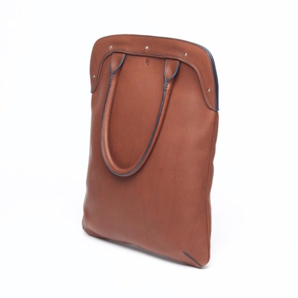 This slim handbag with round handles can be worn on the shoulder. It can accommodate A4 documents and a tablet. It closes with spherical metal buttons (collar buttons).